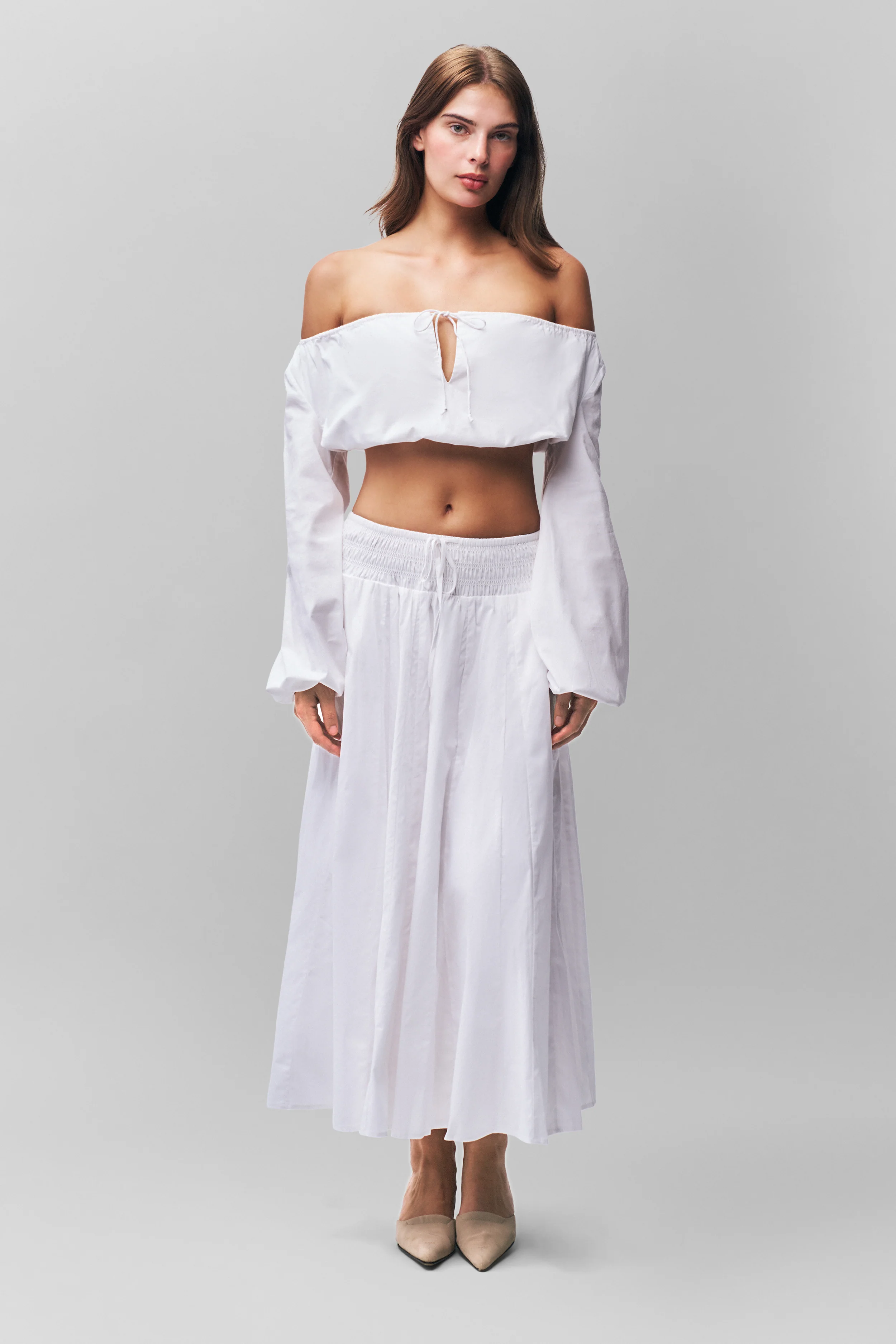 - The Guilia Maxi Skirt features a smocked waistband with a chic tie detail. It has pleated details that create an elegant, flowy style, all crafted from a beautiful cotton fabric for a touch of sophistication.